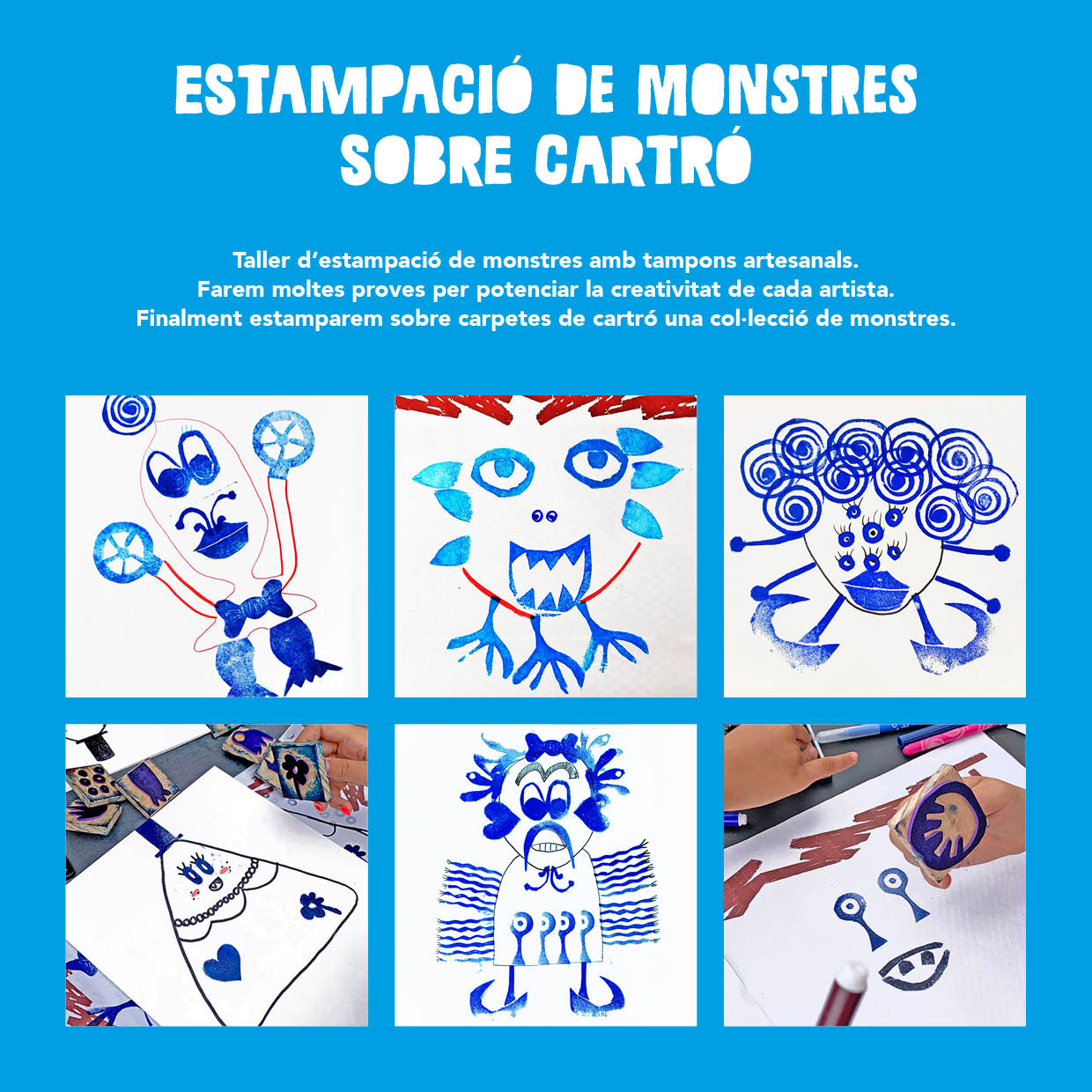 Taller d'estampació de monstres amb tampons artesanals. Farem moltes proves per potenciar la creativitat de cada artista. Finalment estamparem sobre cartró una col·lecció de monstres.