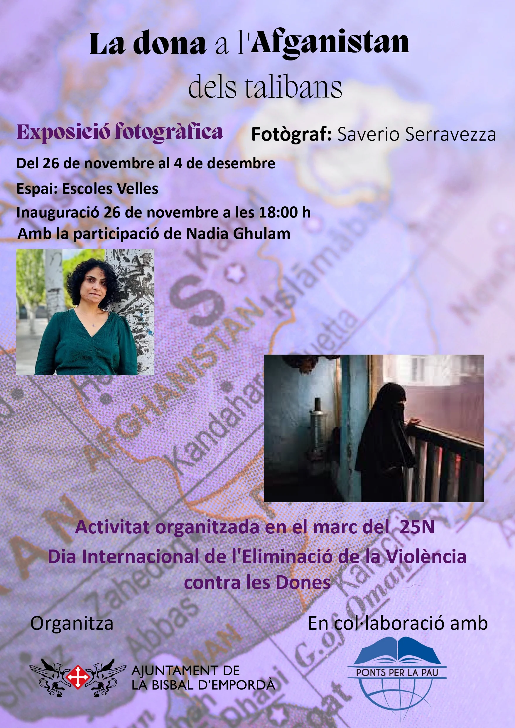 En el marc dels actes per la commemoració del 25 de novembre, Dia Internacional per a l’Eliminació de la Violència envers les Dones, l’Ajuntament de la Bisbal d’Empordà, a través de la Regidoria d’Igualtat, presenta l’exposició “La dona a l’Afganistan dels talibans” una mostra fotogràfica creada per l’ONG “Ponts per la Pau” que vol donar visibilitat a la realitat de les dones i les nenes a l’Afganistan sota el règim talibà, així com al seu coratge i esperit de resistència. Fotògraf Saverio Serravezza